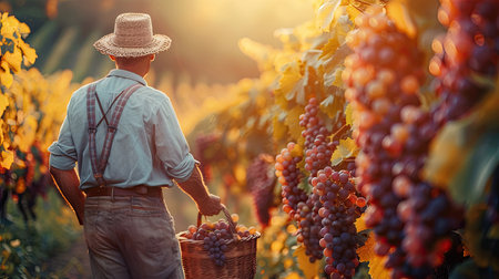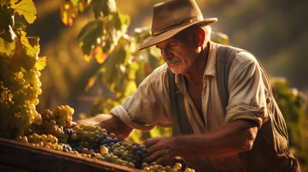 Senior winemaker harvesting grapes in a vineyard on a sunny day. Generative AI illustration