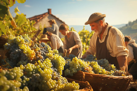 In sun-drenched vineyard a group of people gathers to participate in the annual grape harvest. Generative Ai