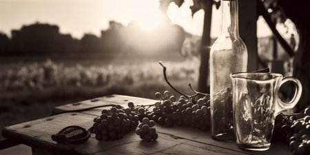 A picturesque arrangement of fresh green grapes and a wine bottle on a rustic wooden table, surrounded by nature, creating a serene vineyard atmosphere perfect for relaxation.