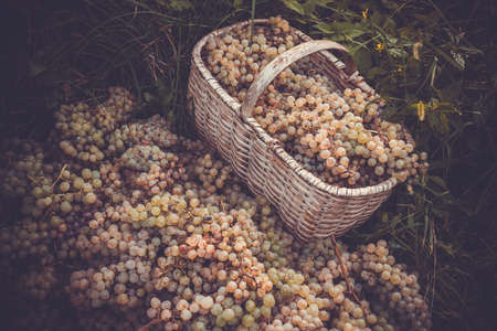 White wine grapes in basket after the harvest at the vineyard. Toned picture