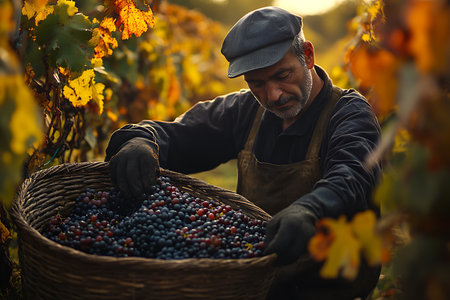 A dedicated vineyard worker stands among grapevines, holding a crate filled with ripe grapes. The warm glow of sunset highlights the rustic setting and man's expression of hard work.