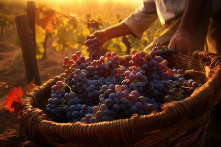 Harvesting Ripe Grapes in Vineyard at Golden Hour.