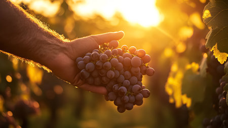 Male hand holding bunch of grapes in vineyard at sunset, closeup