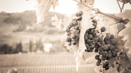 Close up of grape fruits on the vine tree. Agriculture and nature concept. Copy space. BW Sepia toned.