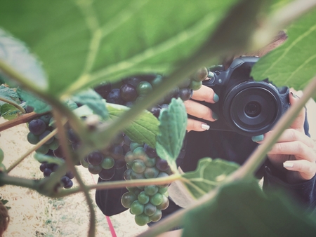 Harvest of grapes. A farmer's hand is cutting a bunch of blue grapes for local wine production at a nearby winery. Wine-making and restauration concept. Travel and agriculture background.