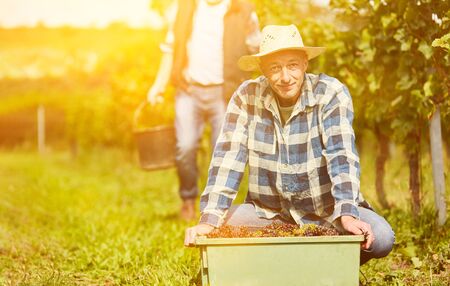Two seasonal workers as harvest helpers for the harvest in autumn with a box full of grapes