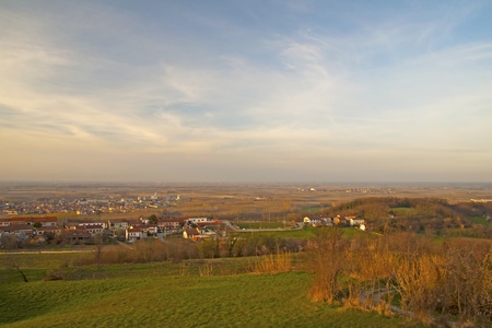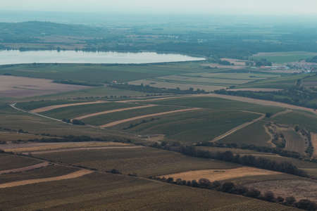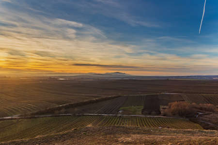Beautiful landscape below the Palava region in the Czech Republic in Europe. Photographed from Hradistek. In the background is a nice sky at sunset.