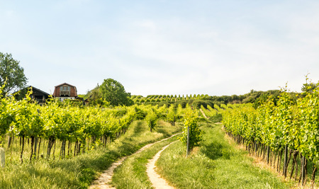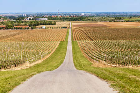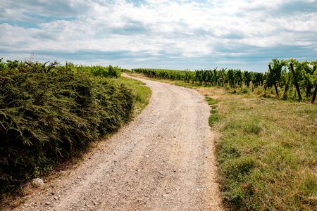 Beautiful rows of young grapes in the countryside with the wine road going through the vineyard in Ilok, Croatia