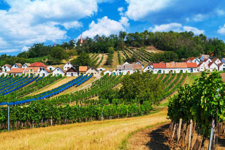 View to church of village Oggau behind vineyards in Burgenland - Austria