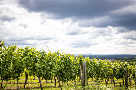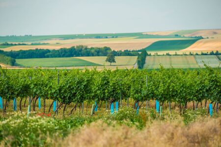 View of the vineyard during warm and sunny weather near Kyjov, South Moravia, Czech Republic. Grape field growing for wine.