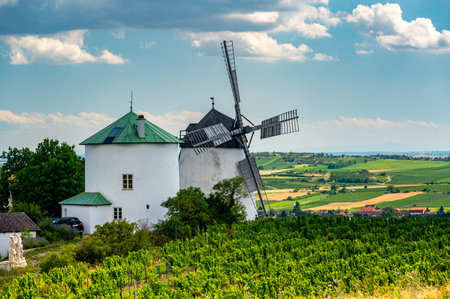 Historic windmill near Retz, Austria, surrounded by vineyards under a clear blue summer sky. The last functional windmill in the country, set in a scenic wine region.