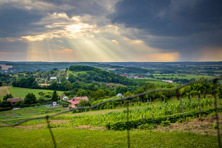 Beautiful View Of Austrian Countryside With Vineyard Vines Meadow Farmland And Rolling Hills In Summer.