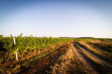vineyard sunset landscape near a country road with grass in morning light clear sky and hills in the background