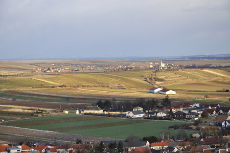 Nice vineyard plant with small village, agriculture, south moravia, Czech republic