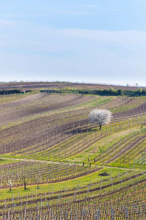 Rows of vineyards in spring. White lonely blossoming cherry tree among vineyards. Spring scenic rural landscape of South Moravia in Czech Republic during sunset