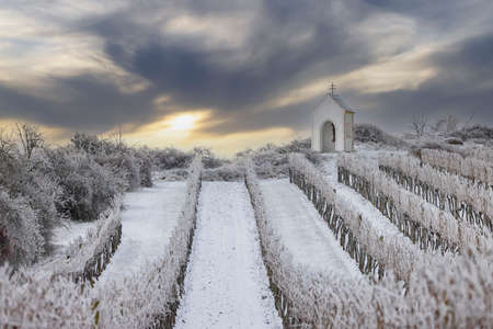 Sunrise over the vineyards of the Czech Republic. Beautiful winter scenery.