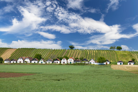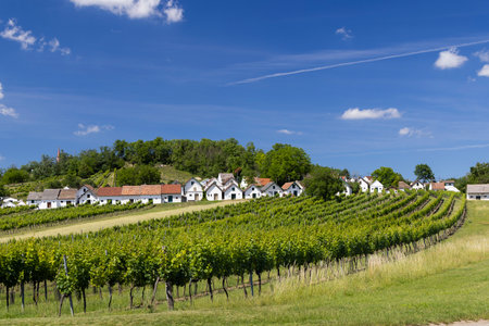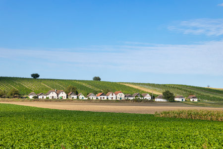 Historic Kellergasse houses nestled in vineyards and green fields under a clear blue sky
