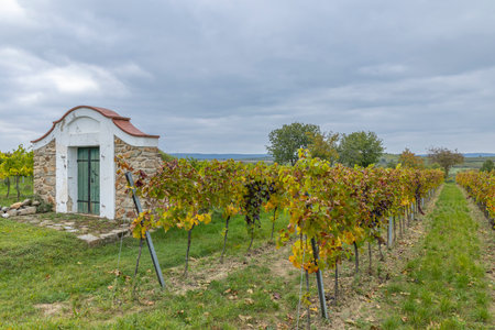 Traditional stone wine cellar house in an Austrian vineyard with colorful grapevines