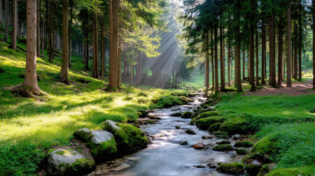 A beautiful forest scene featuring a gentle stream flowing through vibrant greenery. Sunlight beams filter through tall trees, illuminating the landscape.