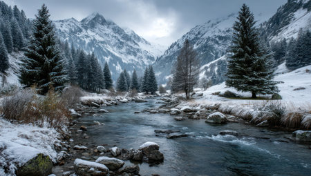 Ethereal Winter Landscape: A Stream Flows Through a Snow-Covered Mountain Valley