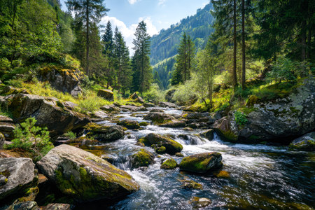 Cold shallow stream winding through majestic pine trees of Tatra mountain range near Zakopane, Poland. Beautiful Low Tatras alpine landscape with forest in the foreground
