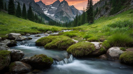 Crystal-clear water gently flows through vibrant greenery, amid towering summits and dense pine trees, evoking tranquility and untouched wilderness.