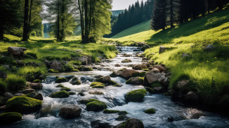 A tranquil, clear water creek winds gently through vibrant greenery, surrounded by towering trees and mossy rocks, evoking peaceful wilderness serenity.