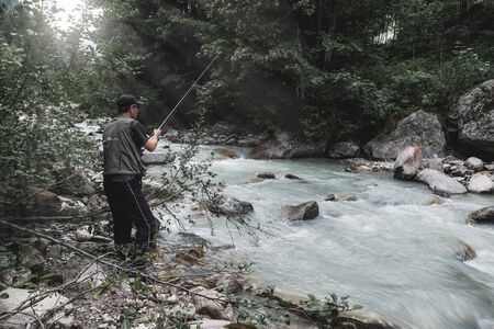 Fishing adventures. Fisherman on a mountain creek fishing for trout. Active sport concept in nature