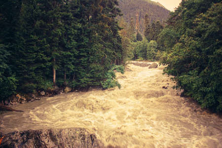 Rocky mountain river among the pine trees. Beautiful fast-flowing river in the coniferous forest. The wild nature of Altai.