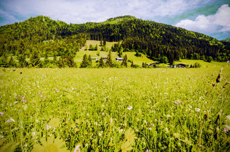 Austrian landscape with forests, fields, pastures and meadows on the background of green hill. Vintage style