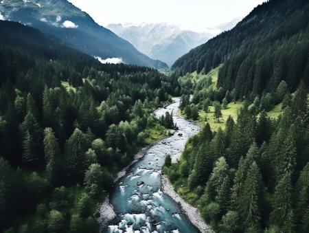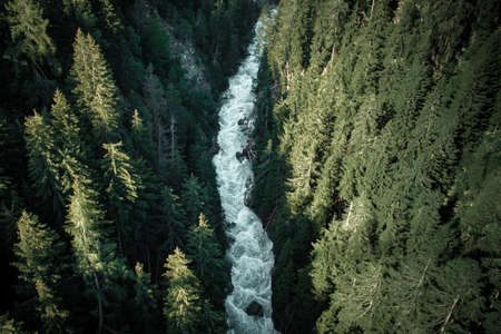 An aerial perspective showcases a river's powerful flow amidst a dense forest. The turquoise water contrasts with the green foliage, creating a dynamic composition. Overhead lighting illuminates the textures of the water and trees. Ideal for illustrating environmental themes and natural beauty, the image suits various editorial or commercial applications.