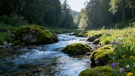 Mountain river in the forest. Beautiful summer landscape with wildflowers.