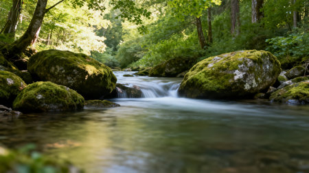 A sacred glen hosts a cascading waterfall, embodying faith and renewal The serene mountain landscape radiates peace as water gently flows over rocks, creating a healing atmosphere Captured at ground level, the image showcases crystal-clear water and textured stones, highlighting nature's beauty This picturesque scene invokes a sense of constant AI Generative