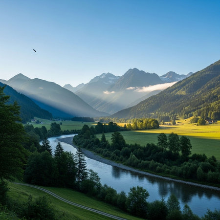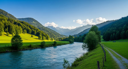 A serene river flows gently through a lush valley surrounded by towering mountains. Smooth stones line the riverbank, while vibrant greenery thrives under a clear blue sky.