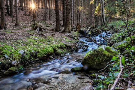 Small mountain creek in the forest. Dramatic image.