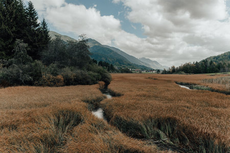 A beautiful fall scenery with creek through grassland at Zelenci nature reserve in Slovenia