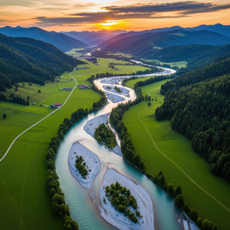 An aerial perspective captures a river snaking through a vibrant green valley, framed by rolling hills. The late afternoon sunlight bathes the landscape in warm tones. The composition is reminiscent of a natural paradise. This image may be suitable for travel, environmental, or scenic themes.