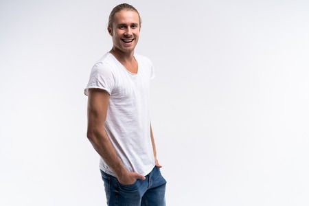 Portrait of a young man in a white t-shirt on a gray background