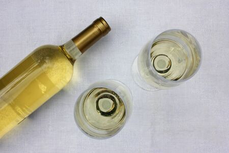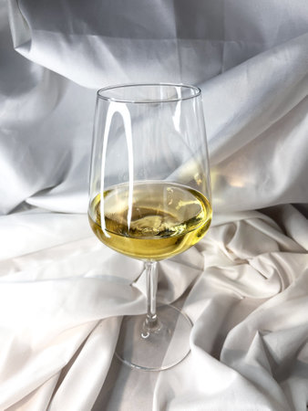 White wine chardonnay sauvignon blanc glass on a white textile background. Top view.