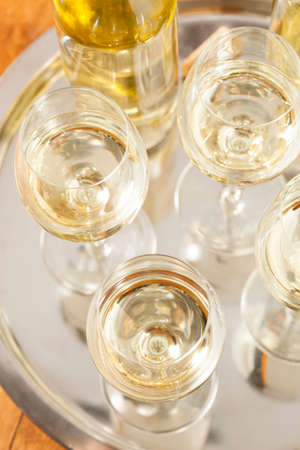 White wine in glasses standing on wooden tray closeup