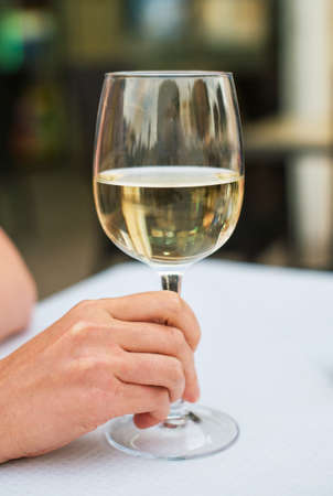 Man holding white wine glass.