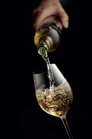 Pouring white wine in a glass goblet. Black background with copy space.