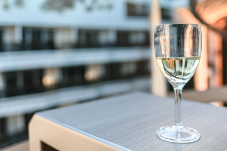 White wine served outside on balcony on glass table with sea view close up