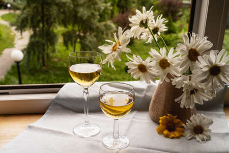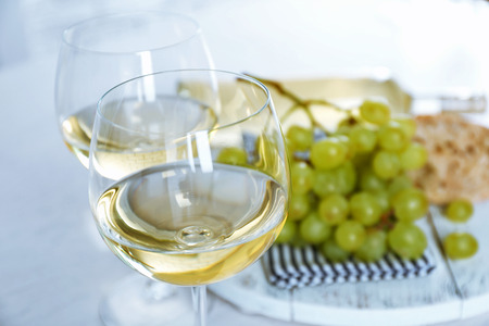 Two glass of white wine standing on the table