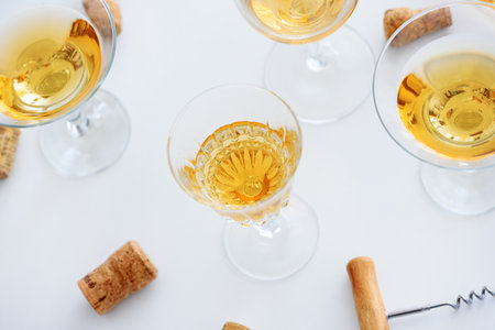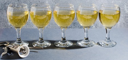 Set of glasses of yellow wine at wine tasting on white wooden table