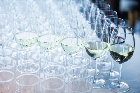 A lot of wine glasses with a cool delicious champagne or white wine at the bar. alcohol background.
