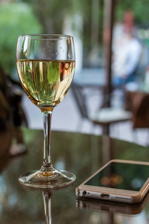 Glass of white wine on table in sunlight. Atmosphere of delightful event