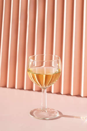 glass of white wine on a coral isometric background with sharp shadows