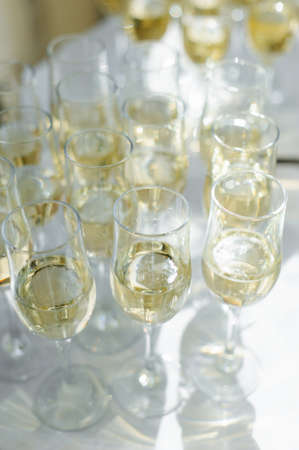 Elegant glasses with white wine at a party