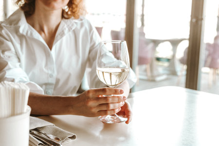 Graceful hand of a caucasian woman in a white shirt is hoding a wineglass in a restaurant. Night out, wine tasting, close-up.